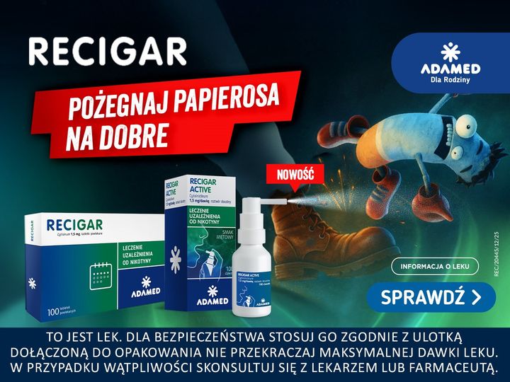 Informacja o produkcie leczniczym Recigar Active. Nazwa produktu leczniczego. Recigar Active, 1,5 mg/dawkę, roztwór doustny. Nazwa powszechnie stosowana substancji czynnej. Cytyzyniklina (poprzednio stosowana nazwa: cytyzyna). Dawka/stężenie substancji czynnej. Każda dawka (uruchomienie pompki) zawiera 1,5 mg cytyzynikliny. Substancje pomocnicze o znanym działaniu: Każda dawka produktu leczniczego (0,19 ml) zawiera: 0,17 mg etanolu, 44,87 mg glikolu propylenowego i 1,71 mg pirosiarczynu sodu. Postać farmaceutyczna. Roztwór doustny. Bezbarwny do żółtego, przezroczysty płyn o smaku miętowym. Wskazanie lub wskazania terapeutyczne do stosowania Zaprzestanie palenia tytoniu i zmniejszenie głodu nikotynowego u dorosłych palaczy, którzy chcą przestać palić. Celem stosowania produktu leczniczego Recigar Active jest trwałe zaprzestanie stosowania produktów zawierających nikotynę. Podmiot odpowiedzialny. Adamed Pharma S.A. Pieńków, ul. M. Adamkiewicza 6A, 05-152, Czosnów, Polska. Niniejsza informacja została przygotowana na podstawie Charakterystyki Produktu Leczniczego Recigar Active, 1,5 mg/dawkę, roztwór doustny, zatwierdzonej 10.07.2025 z którą należy się zapoznać przed zastosowaniem leku. Dodatkowe informacje dostępne są w Adamed Pharma S.A. Pieńków, ul. M. Adamkiewicza 6A 05-152 Czosnów. Tel.: +48227327700, fax.: +48227327700, e-mail: adamed@adamed.com